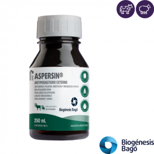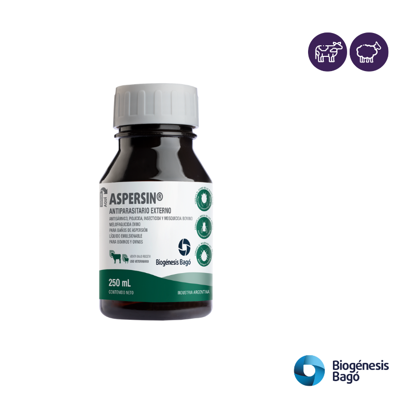 Antisárnico bovino: Se dosifica a razón de 1 L de ASPERSIN en 1.333 L de agua, equivalente al contenido de un frasco de 250 mL en 333 L de agua. Los animales deben ser perfectamente mojados en toda la superficie corporal, con especial atención a las lesiones y los pliegues de la piel.