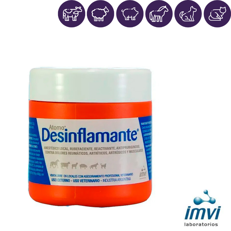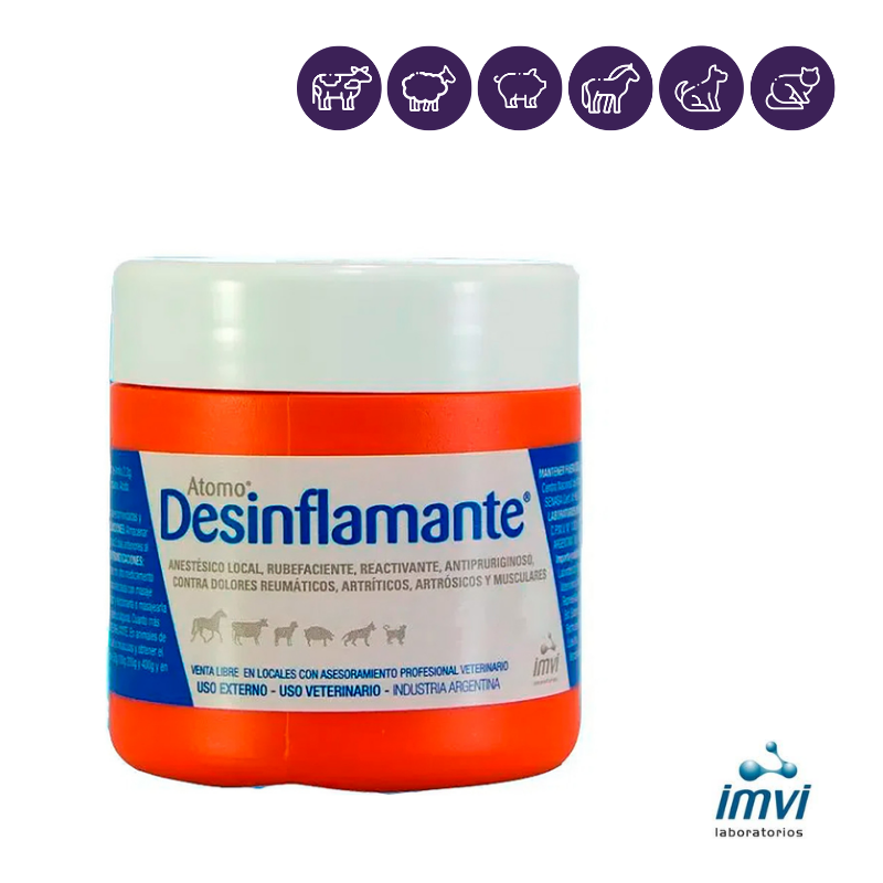 Salvo mejor criterio profesional ATOMO DESINFLAMANTE puede ser utilizado para tratar con favorables resultados todo tipo de dolores, musculares, tendinosos, articulares, ligamentos o nerviosos. Bien indicada para reumatismo muscular y articular, contusiones, esguinces, torceduras, neuritis, neuralgias, mialgias, dolores por esfuerzo, mastitis y hematomas, en equinos, bovinos, camélidos, ovinos, porcinos, caninos y felinos. También está indicado en casos de prurito por urticaria. En abscesos y tumoraciones deberá aplicarse con fuerte masaje varios días consecutivos hasta producir la maduración del proceso. En atrofias musculares de cualquier origen ATOMO DESINFLAMANTE se recomienda aplicar por varios días consecutivos en la zona afectada con fuerte masaje. En caballos de trabajo, pura sangre de carreras, perros de caza, gallos de riña y otros animales de deportes, etc. se recomienda aplicar ATOMO DESINFLAMANTE antes y después del entrenamiento o del trabajo, masajeando la pomada, en los músculos del aparato locomotor, hasta su total absorción para que cumpla los más benéficos resultados.