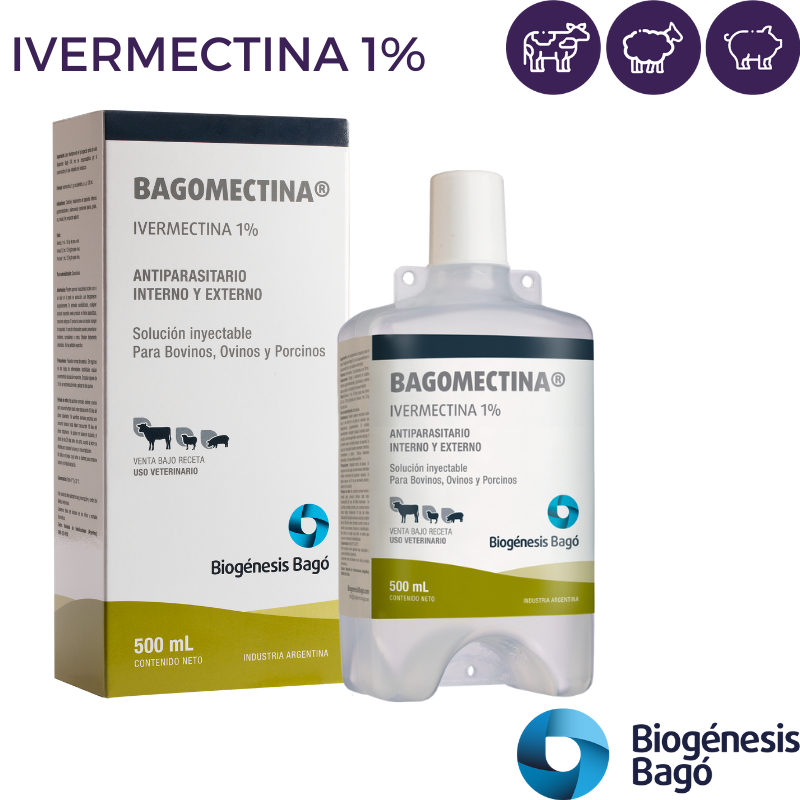 Antiparasitario interno y externo para bovinos, ovinos y porcinos, que combate los parásitos gastrointestinales,pulmonares, sarna, piojos, ura y miasis. Solución inyectable de ivermectina al 1%.