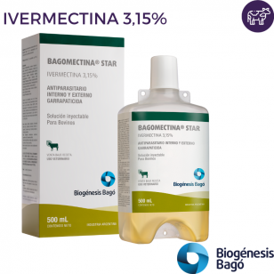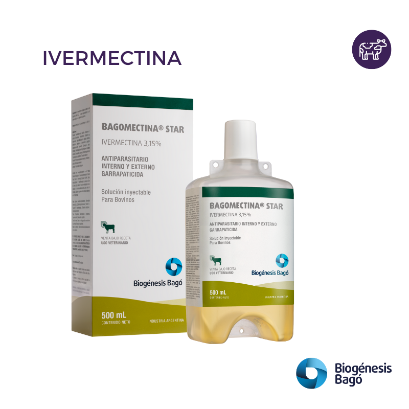 Antiparasitario interno y externo y garrapaticida para bovinos, que combate parásitos gastrointestinales, pulmonares, garrapatas, miasis cutáneas, moscas y piojos.Solución inyectable de ivermectina al 3,15%.