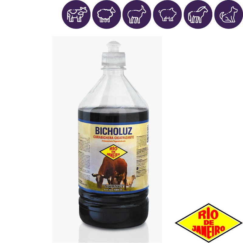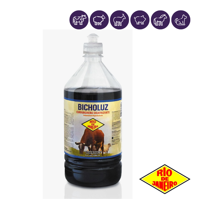 BICHOLUZ RJ es un producto especialmente desarrollado para el tratamiento y prevención integral de las miasis con una sola aplicación. La gran actividad germicida y larvicida se refuerza con la acción cicatrizante de su compuesto ácido tánico. El ácido tánico es hemostático, detiene la hemorragia producida por el acto quirúrgico, precipita las albúminas e impide el medio favorable para que desoven las moscas y se produzca la miasis (Bichera). Mata larvas por contacto directo, destruyéndolas en el acto por condensación protoplasmática. Destruye los gérmenes asociados por su contenido alcohólico y precipita las albúminas de los tejidos lacerados o dañados favoreciendo la rápida cicatrización. Por su baja tensión superficial penetra en las heridas desgarrantes ejerciendo su acción en forma profunda destruyendo las larvas que se encuentra alojadas en “túneles” El contenido de un fosforado en su fórmula da una acción residual que, conjugada con la acción larvicida y cicatrizante, nos pone frente a un curabichera ideal.
