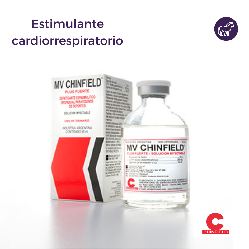 Anoxia cardíaca. Depresión respiratoria y para cuando se desee aumentar el volumen de aire inspirado.Para reducir la fatiga producida por el mayor esfuerzo físico. Coadyuvante de tratamientos para evitar hemorragias de esfuerzo (hemorragia pulmonar inducida por el ejercicio). MV CHINFIELD® también está indicado en casos de reacciones alérgicas respiratorias por cama de paja, viruta y diversos alérgenos del establo que pueden aparecer en caballos sensibles.