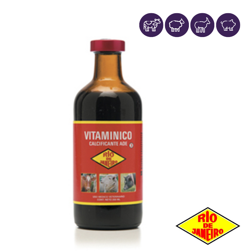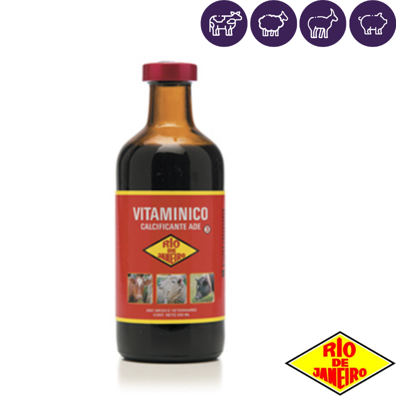 El VITAMINICO ADE Río de Janeiro es una asociación farmacológica que conjuga tres acciones básicas: antianémico, vitamínico y prevención de la hipocuprosis. La acción antianémica está dada por la presencia de 1.5 mg de hierro, 2.5 mg de cobalto y 0.5 mg de vitamina B12 por cada 10 ml de producto. La acción vitamínica se centra en el aporte de 40000 UI de Vitamina A, 5000000UI de Vitamina D y 12 UI de Vitamina E por cada 10 ml de producto. Prevención de hipocuprosis, ya que aporta 7mg de cobre, cantidad suficiente para tratar la carencia subclínica de dicho elemento. Por lo antes expresado, el VITAMINICO ADE RJ se recomienda: - Como fuente complementaria de minerales y vitaminas en el crecimiento, engorde, lactación, gestación y animales en producción. - En el crecimiento y en todos los casos de retrasos, desmejoramiento y desnutrición. - En la terminación de novillos, en los casos de animales con penurias alimenticias, convalecientes, parasitados. - En todos los casos donde es necesario aportar vitaminas, D y/o E. - Como complemento en el tratamiento de enfermedades infectocontagiosas y/o anemizantes.